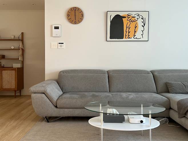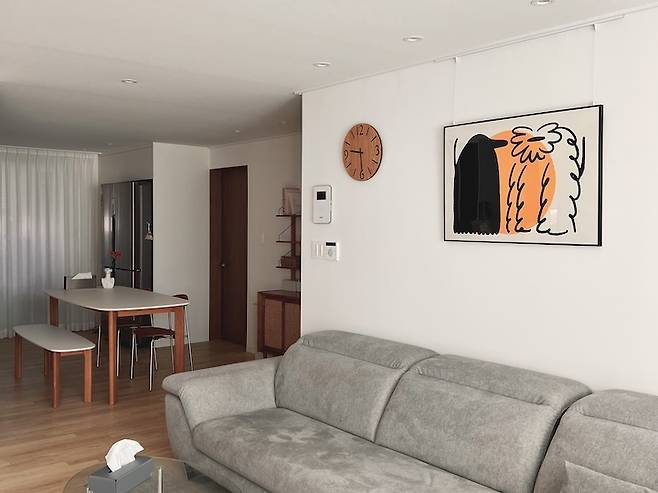 소파 위에는 요즘 유행하는 드로잉 액자를 달았어요. 두마리 강아지가 나란히 있는데 옐로우 포인트가 들어가서 집이 더 따스해 보여요. 시계는 10년 전에 모던하우스에서 산 시계인데 집이랑 잘 어울려서 달았어요. 10년 전에도 우드를 좋아했나 봐요 :)