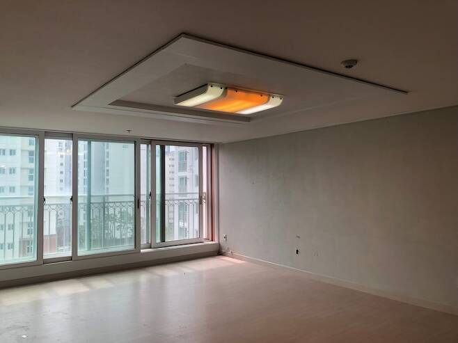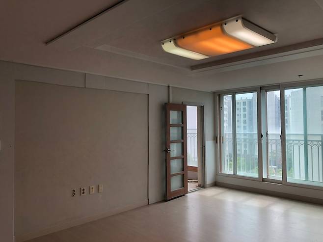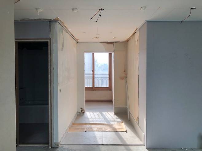 기존의 집은 베란다가 확장공사를 해서 거실에 베란다로 통하는 문이 있었어요. 저 문을 통해 베란다로 이동해서 편하지만 거실을 바라볼 땐 문 때문에 깔끔한 느낌이 덜 할 것 같아 문을 없애기로 결정했습니다.