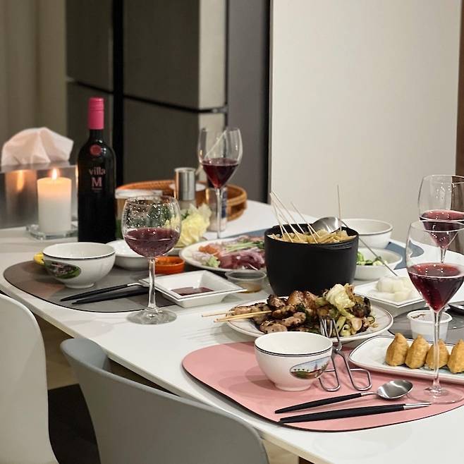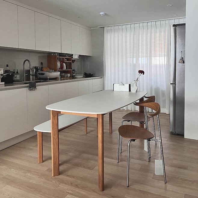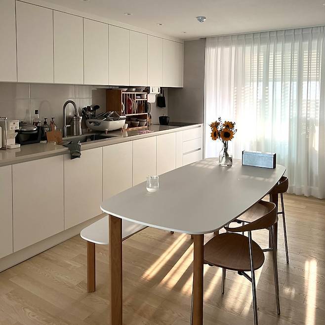 테이블이 넓다 보니 손님이 오면 이 장소에서 대부분의 시간을 보내요. 독립적인 주방 구조다 보니 카페 같기도 하고 아침에 가족들이 삼삼오오 모이는 장소가 되었어요. 서재 방을 아직 꾸미기 전이라 식탁에서 오늘 할 요리를 찾아보거나 아이 공부 준비를 하고, 남편은 업무 준비를 하며 시간을 보내기도 해요.