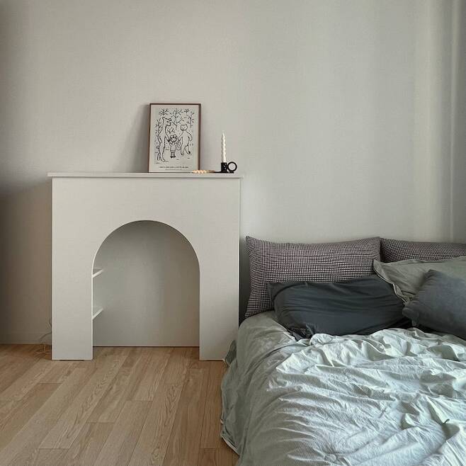 아빠와 와니가 자는 침실인데 와니의 책상은 거실에 있기 때문에 이곳은 오롯이 잠만 자는 방이에요. 벽난로 콘솔을 두어서 아늑함을 강조했어요.