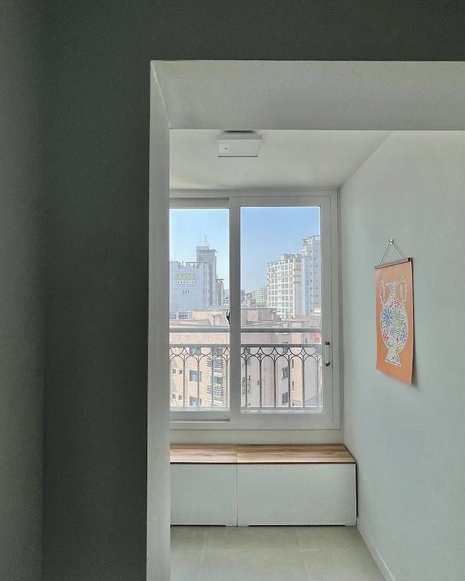 베란다가 확장된 집이라서 평수 대비 넓어요. 샷시(새시)는 아직 쓸만해서 교체하고 들어오지 않았지만 방충망은 미세촘촘망으로 교체했어요. 방충만 교체 시 모헤어 교체도 꼭! 해야 해요. 저희 집은 낡은 모헤어 교체를 안 해서 벌레가 많이 들어와서 올해 다시 교체했어요.