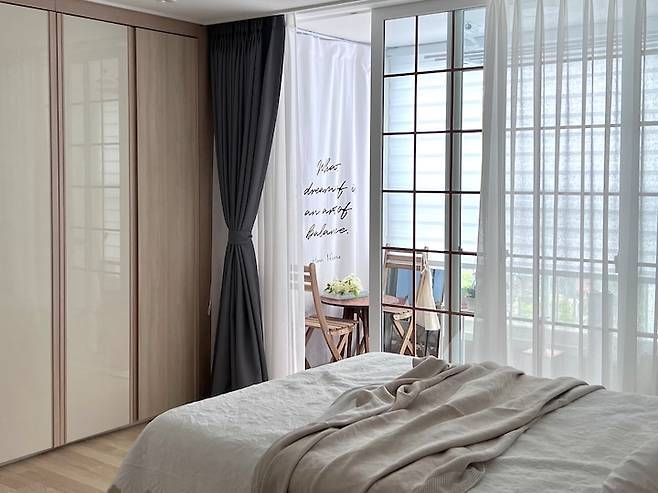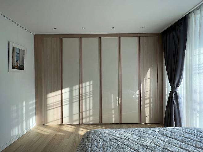 그런데 막상 입주를 하고 사니 이 격자 창문이 있어서 침실이 밋밋하지 않고 더 예뻐 보이는 거예요. 지금은 저희 침실의 매력 포인트가 되었어요.