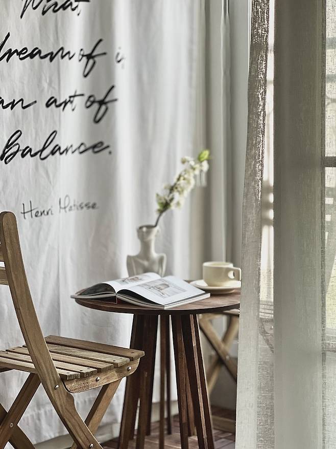베란다에는 붙박이장이 하나 있는데 문이 안 예뻐서 가리려고 커튼을 달았어요. 그랬더니 분위기가 진짜 카페 같은 느낌이 나요 :)