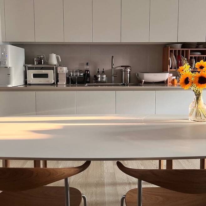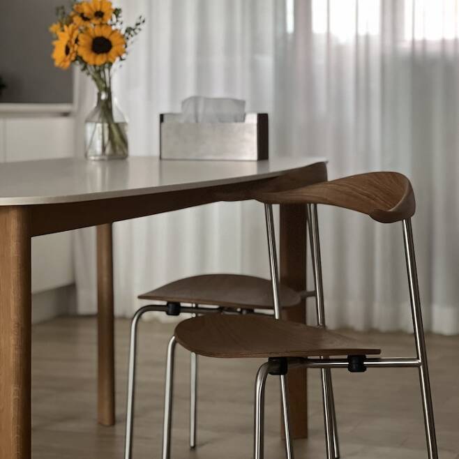 식탁의자는 이번에 새로 구입한 칼한센 CH88 체어예요. 등받이의 곡선이 너무 예뻐서 샀어요. 또 식탁하고 높이도 잘 맞아서 더 깔끔해 보인답니다.
