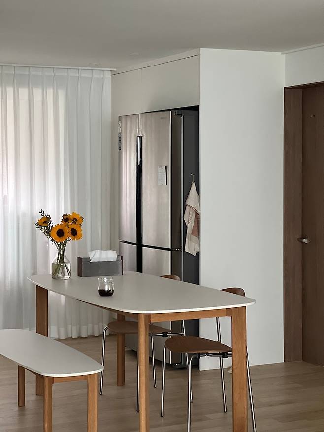 결혼한 지 10년 차가 다 되었기 때문에 냉장고는 옛날식 스테인리스 냉장고랍니다. 이사 올 때 요즘 유행하는 비스포크 냉장고를 들일까 고려했어요. 그런데 이 냉장고가 신기하게도 낡지 않는 거예요^^;; 또 다른 우선순위의 가구들이 있었기 때문에 나름 멀쩡했던 냉장고는 구입하지 않았습니다.