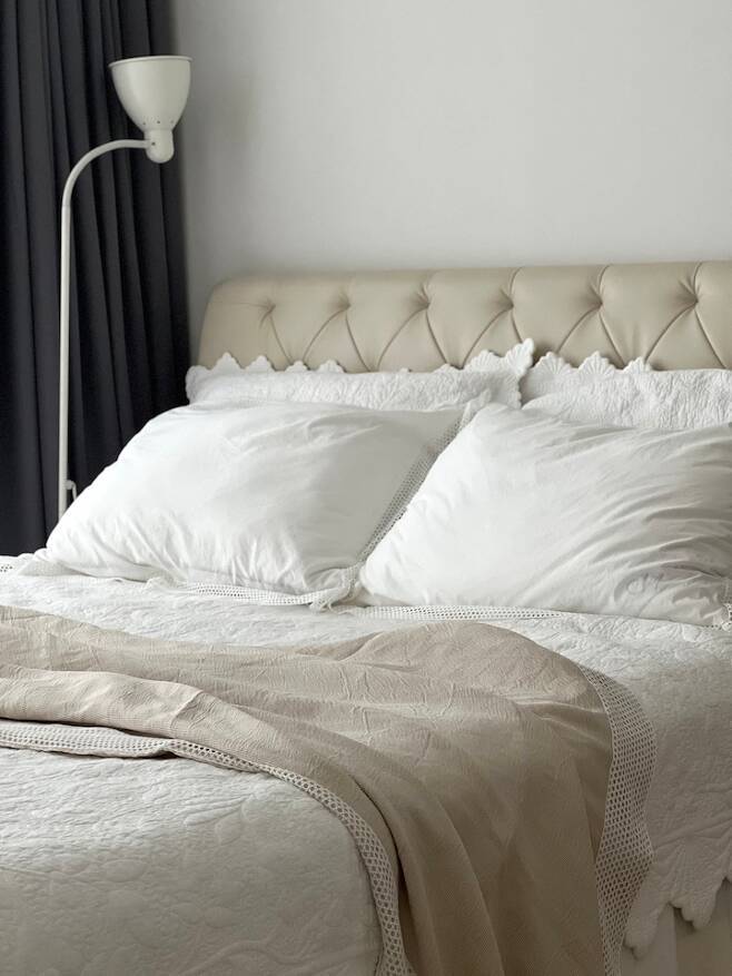 매트리스에 베드 스커트를 입히고 밑으로 늘어지는 넓은 면적의 스프레드를 깔았어요. 그럼 위에 올라가는 베딩을 가지런히 정리하지 않아도 예쁜 느낌을 준답니다.
