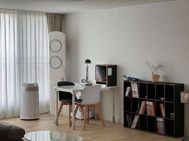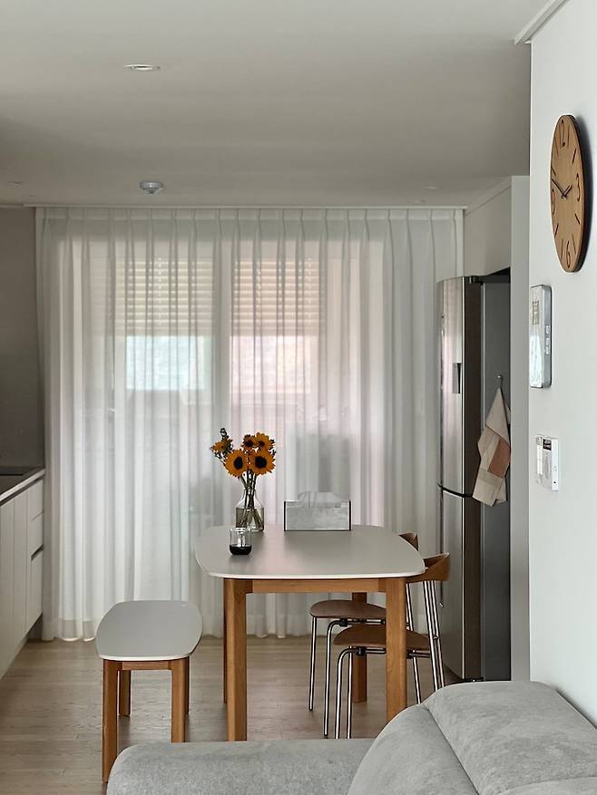 그리고 살아보니 동향도 장점이 매우 많아요. 해가 일찍 떠서 아침에 잠에서 깨서 거실로 나오면 엄청 밝아서 기분 좋게 하루를 시작할 수 있어요. 그리고 저녁엔 서쪽인 현관과 부엌에서 노을빛이 들어오는 데 그 모습이 너무 예뻐요. 동향이지만 이 집은 앞뒤로 동간 거리가 넓어서 낮에도 그렇게 어둡지 않고 바람도 잘 통해요. 다만 여름 아침은 동향 쪽 방이 좀 더워서 에어컨 설치를 꼭 해야 해요.