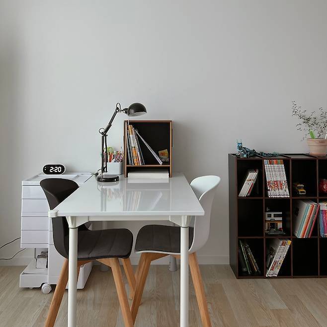 아이의 책과 교구들은 모두 알록달록해서 책상, 의자, 책장의 컬러를 블랙&화이트로 구성했어요. 책상은 아이가 4세 때부터 쓰던 책상인데 8살이 되면서 책상다리만 교체해 주고 책상 위 책꽂이와 책장은 같은 브랜드에서 같은 디자인으로 구매해서 통일감을 주었어요.