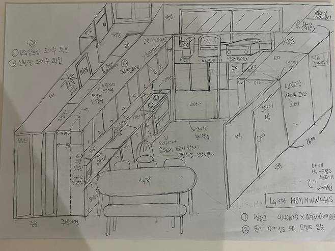 식탁 자리가 애매해져서 일자 주방구조로 변경하기로 하였습니다. 일자 주방을 만들기 위해선 1미터 정도 가벽을 쳐야 했는데 상상이 되지 않아 부족한 그림 솜씨로 주방 상상도를 그려 봤습니다. ^^;; 수정에 수정을 거듭하면서 채워나가다 보니 제가 원하던 느낌으로 주방이 만들어진 것 같아요.