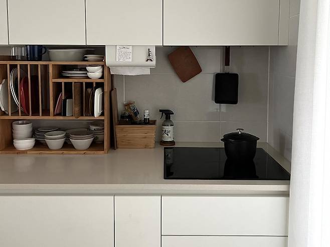 요리를 하고 상부장을 열고 그릇을 빼서 요리를 담는 것이 불편해서 주방 상판에는 그릇장을 배치했어요. 그릇장의 우드 칸막이가 통일감을 주기 때문에 각기 다른 그릇을 넣어도 그릇이 정돈되어 보이는 효과가 있어요. 또 키친타월 걸이를 상부장에 배치해서 주방상판 위를 더 여유롭게 쓰도록 하였습니다.