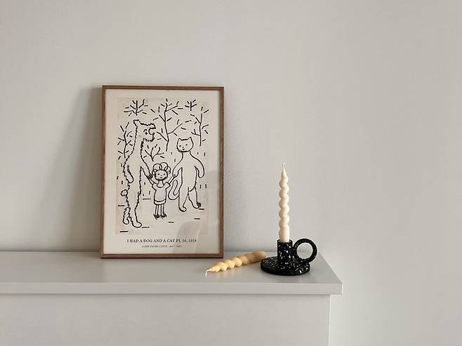 이 그림은 왠지 우리 가족 같아서 산 그림이에요. 주변 나무들은 가지가 앙상하지만 강아지와 아이와 고양이가 손을 잡고 있는 느낌 때문에 따스해 보여요. 늘 저렇게 손을 잡고 다니는 우리 가족의 모습이에요:)