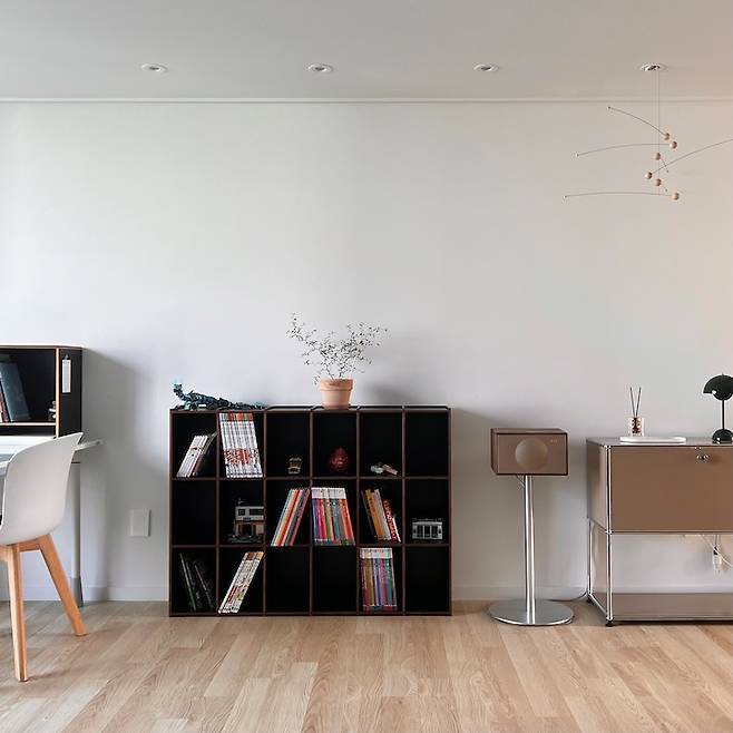 거실 한쪽에는 거실장 대신 모듈 가구를 두고 수납 하고 있어요. USM 베이지색은 원래 단종 되려던 색상인데 한국 마루와 잘 어울려서 단종되지 않았다고 해요. 저희 집은 벽지가 하얀색이라서 베이지로 선택했는데 차분한 색상이 넘 예쁘고 옆 제네바 스피커와도 잘 어울려요:)