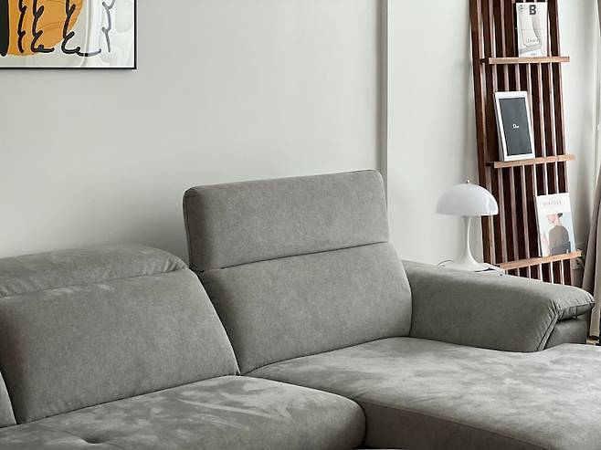 남편이 목받이가 있어야 편하다고 해서 등받이가 움직이는 모델로 구입했어요. 사용할 때는 등받이를 올려 편하게 등을 받쳐놓고 사용 안 할 때 내려놓으면 깔끔해 보여요. 또 팔걸이가 낮고 비스듬히 경사가 져서 누워있기도 편해서 저는 소파에서는 거의 누워있답니다 ㅎㅎ