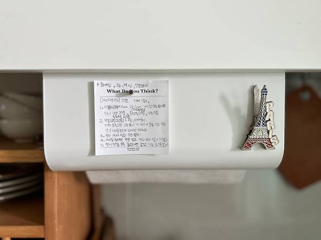 자석 키친타월 걸이에 레시피를 써서 붙이고 요리를 하면 요리 도중 책을 찾아보거나 동영상을 찾지 않아서 돼서 편하답니다.