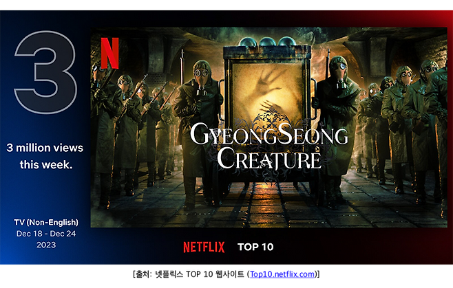넷플릭스 오리지널 시리즈 <경성크리처> 파트1이 공개 3일 만에 넷플릭스 글로벌 TOP 10 3위에 등극했다.