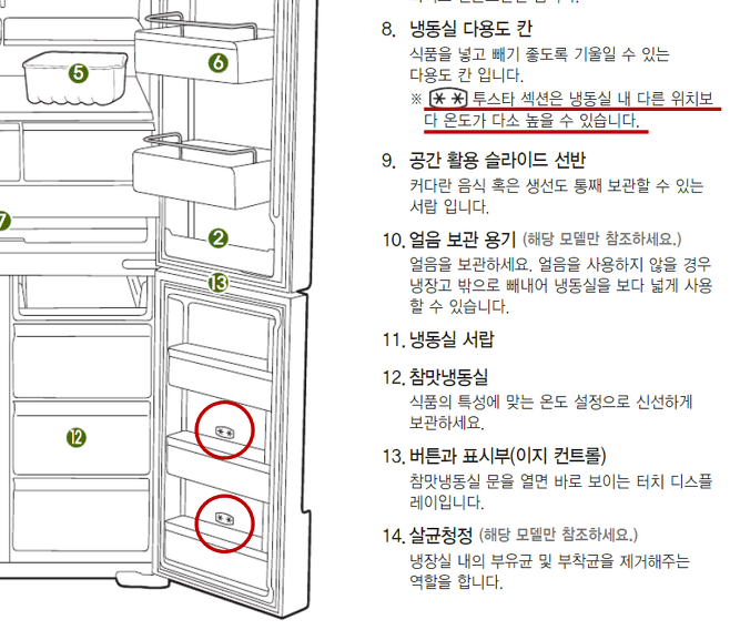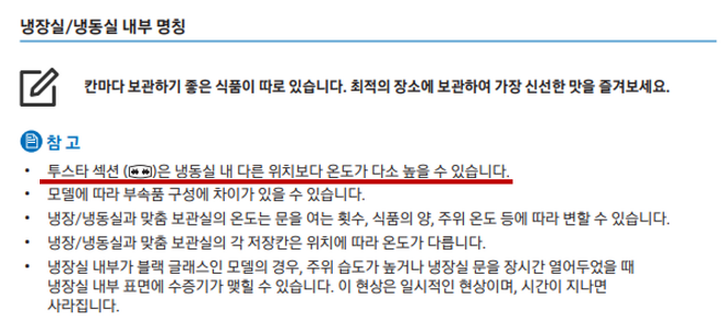 보통 냉동실은 -15~-23℃ 정도인데, 투스타섹션의 온도는 3~5℃가량 높은 온도인 -12~-18℃를 가지고 있습니다. 온도가 다른 냉동실 구간에 비해 높기 때문에 -20℃미만으로 꽁꽁 얼려야하는 아이스크림이나 육류/생선류는 투스타섹션에 보관했을 때 녹아 변질될 수 있습니다.