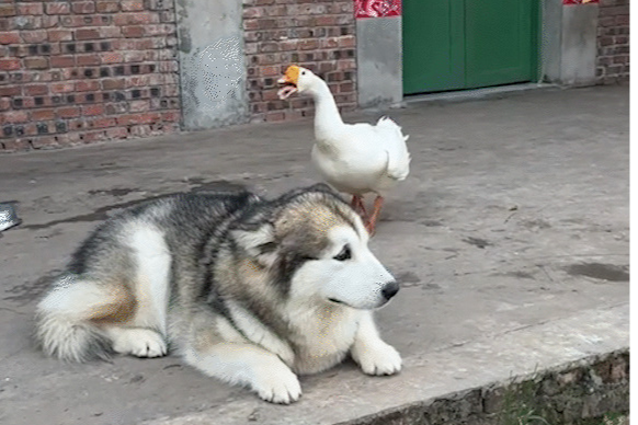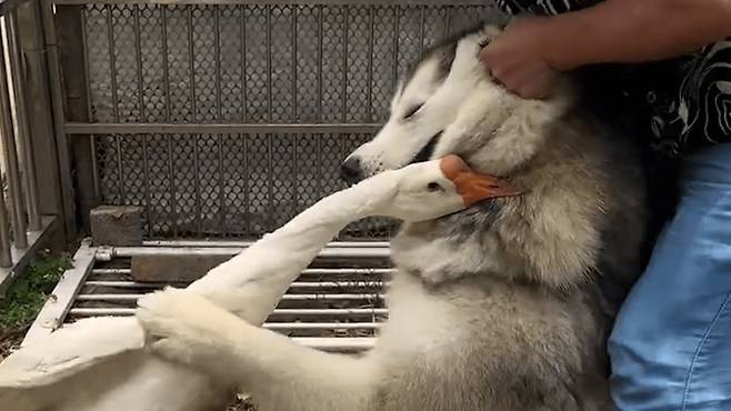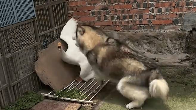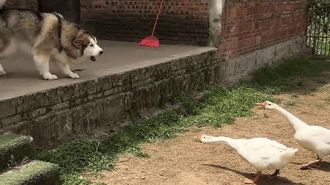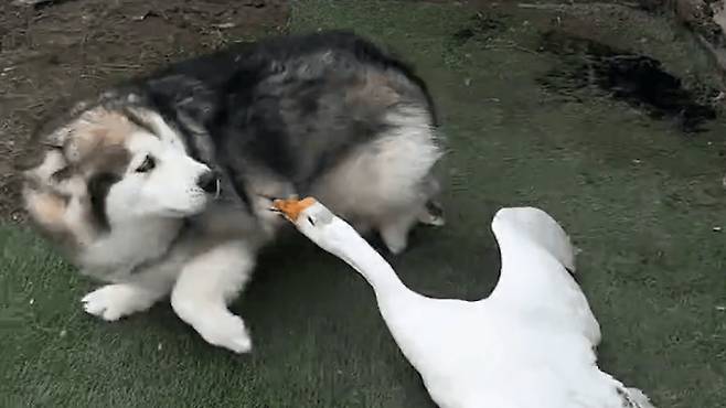강아지와 거위의 대결이 유쾌한 순간을 만들어냈습니다.