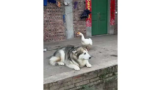 한 남성의 집 앞에서 강아지가 평화롭게 앉아 있었는데, 갑자기 거위 한 마리가 성큼성큼 다가왔습니다.