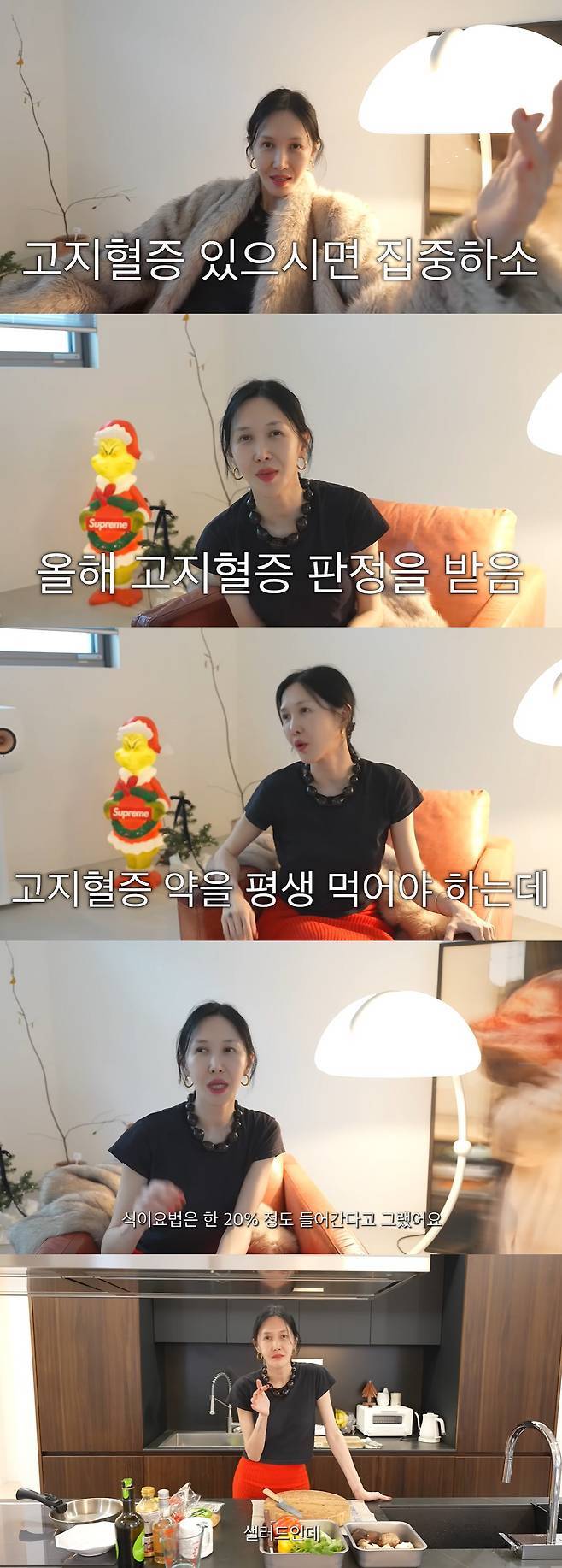윤혜진은 "약을 평생 먹어야 한다. 양심적인 의사 선생님께서는 제게 '44세부터 이 약을 복용하기 시작하면 평생 드셔야 한다. 일찍 먹으면 부작용이 있을 수 있으니 최대한 늦추자'라고 했다. 그래서 운동을 열심히 했고 식단까지 했다"라고 이야기했다. 그러면서 "저는 초등학생 때부터 군것질을 너무 사랑했다. 발레를 하면서 더더욱 그랬다. 남편이 군것질 끊으라고 해서 끊었는데 음식은 크게 영향이 없다고 하더라. 식이요법은 20% 정도 들어간다고 하던데 그래도 (안 좋은 음식은) 안 먹는 게 낫겠다 싶어 고지혈증에 좋은 식단으로 바꿨다"라면서 윤혜진표 샐러드, 버섯 묵 등 레시피를 공개했다.