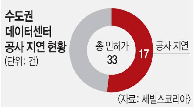 실제 수도권에서 인허가를 받은 데이터센터 2곳 중 1곳은 공사가 지연되고 있다. 글로벌 부동산서비스 기업 세빌스코리아가 지난해 4월 발간한 보고서를 보면 수도권에서 건설 인허가를 받은 데이터센터 총 33곳 중 17곳(51.5%)이 공사가 지연되는 상태였다. 주민 민원이 주요 이유였다.