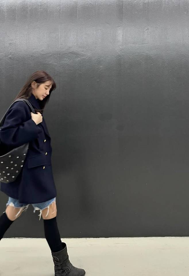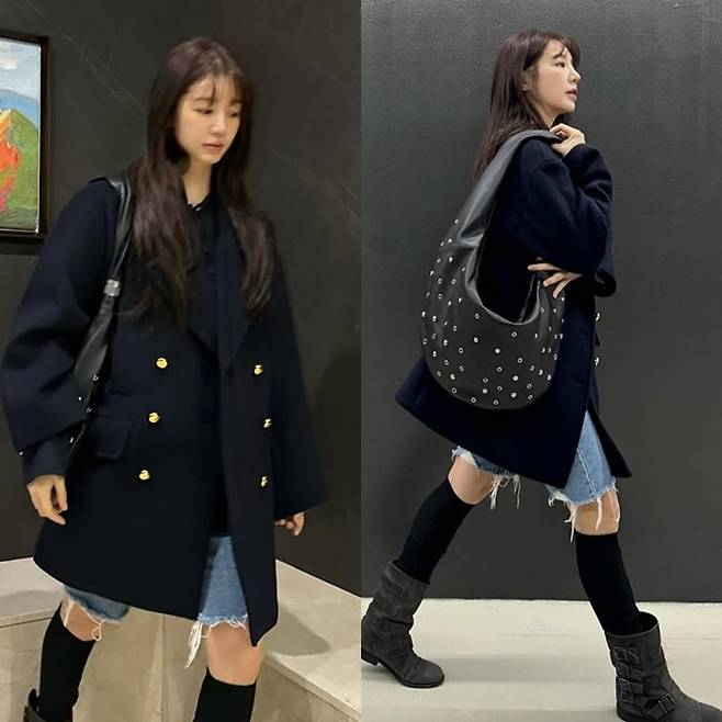 공개한 사진에서 윤은혜는 커팅 데님 반바지에 금빛 더블 버튼이 멋스러운 코트룩으로 한껏 분위기가 업 된 외출 스타일을 선보였다.