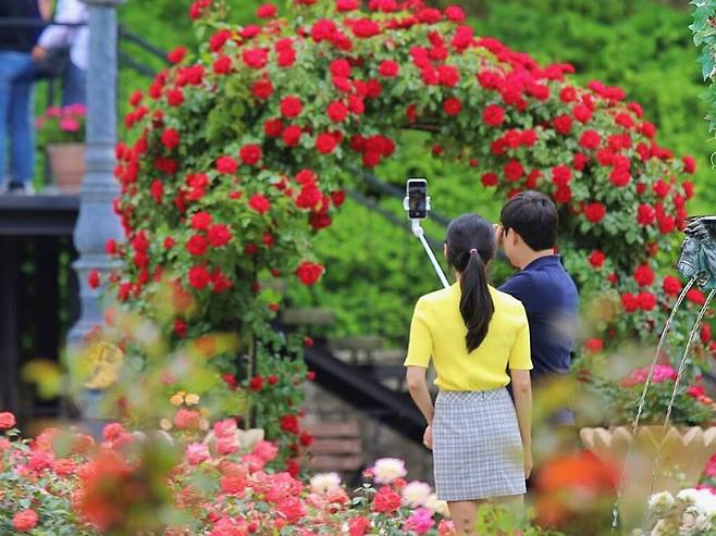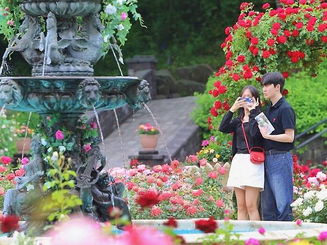 장미원에는 다양한 품종의 장미가 붉은색, 분홍색, 노란색 등 형형색색으로 피어 있어 장미 담장과 큐피트 분수대를 배경으로 인생샷을 남기기에 제격이다.