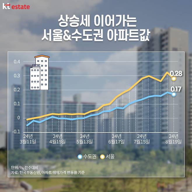 그렇다면 현재 외국인 부동산 매수세가 증가하는 원인은 무엇일까요? 우선 최근 서울을 포함해 수도권을 중심으로 집값이 반등한 것을 그 이유로 보고 있습니다. 한국부동산원이 발표한 ‘8월 3주 주간아파트가격 동향’에 따르면, 서울 아파트 매매가격은 전주 대비 0.28% 오르며 22주 연속 상승세를 나타냈습니다. 수도권 아파트도 전주 대비 0.17% 오르며 13주 연속 상승세를 보였습니다.