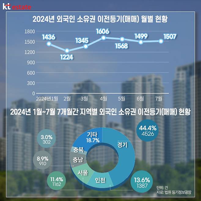 법원 등기정보광장에 따르면, 2024년 외국인 소유권 이전등기(매매) 월별 현황을 살펴보면 △1월 1436건 △2월 1224건 △3월 1345건 △4월 1606건 △5월 1568건 △6월 1499건 △7월 1507건으로 집계됐습니다. 지난 2월 1224건까지 떨어졌지만, 3월부터 다시 상승세를 보이면서 4월부터 7월까지 평균 1500건을 넘겼습니다.