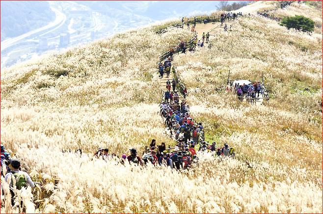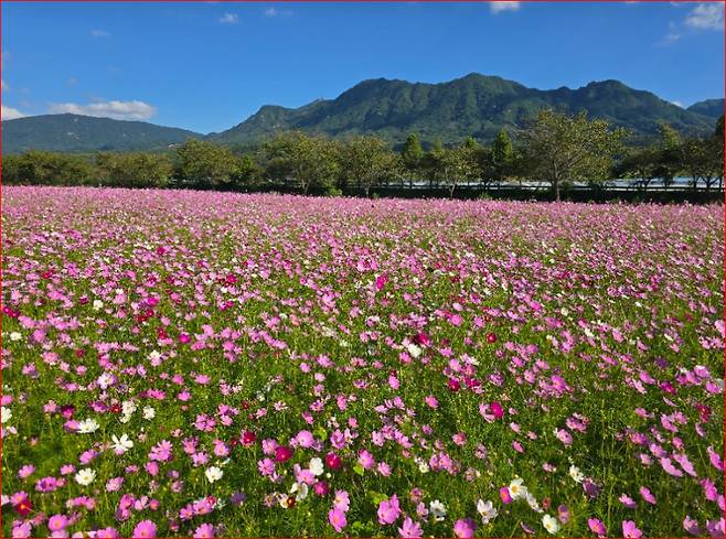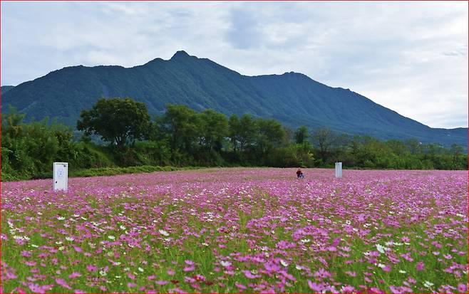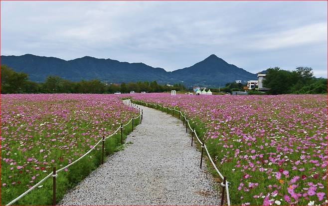 넓게 펼쳐진 꽃밭 사이로 난 산책길을 걷다 보면, 바람에 흔들리는 코스모스 물결이 감각을 깨우고, 주변을 둘러싼 천 미터급 산군이 한 프레임에 담기며 가을의 낭만을 선물합니다.