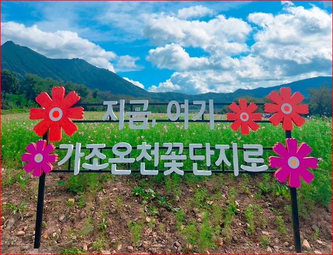 가조온천꽃단지는 매년 심는 꽃이 달라져 새로운 분위기를 선사하는 곳입니다. 황화코스모스의 노란 물결에 이어, 올해는 분홍빛 코스모스가 물결치며 가을의 절정을 보여주고 있습니다.