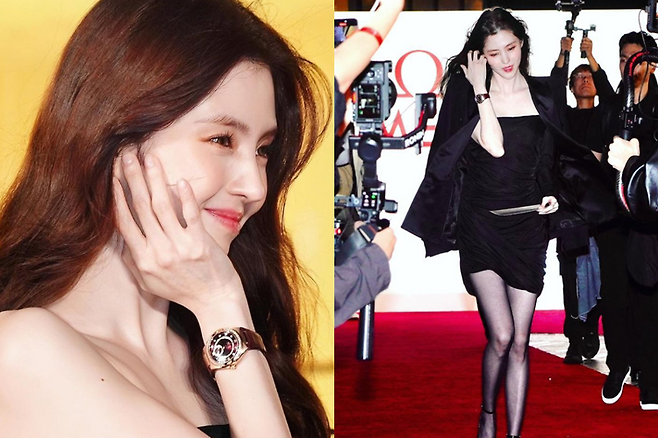 한소희는 튜브톱 블랙 드레스에 시계를 매치해 포인트를 줘 시선을 사로잡았다.