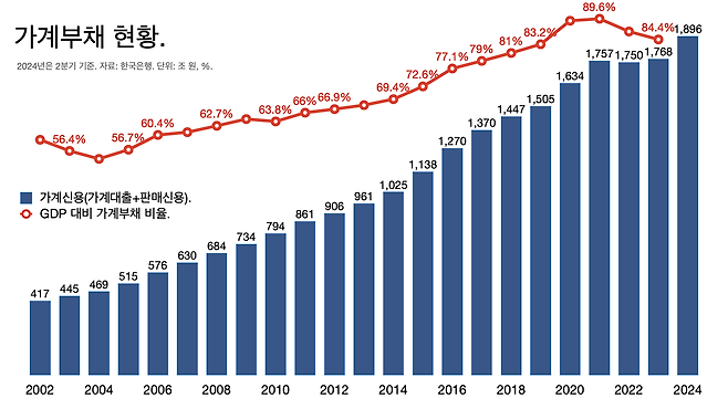 - GDP 대비 가계 부채 비율은 지난해 말 기준으로 84.4%, 여기에 전세 보증금을 포함하면 150%가 넘는다는 분석도 있다.