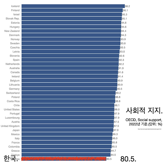 - OECD 사회적 지지(Social support) 지표는 한국이 80.5%로 OECD 회원국 가운데 가장 낮다. 어려움에 부닥쳤을 때 의지할 수 있는 친구니 친척을 둔 사람의 비율을 말한다. 남성만 놓고 보면 78.4%. 노인만 놓고 보면 68.6%까지 떨어진다.