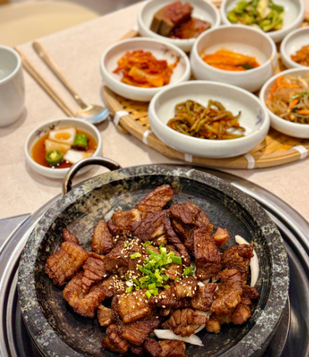 ▶ 초벌구이 후 돌판에 올려 따끈하게 익혀 먹는 방식