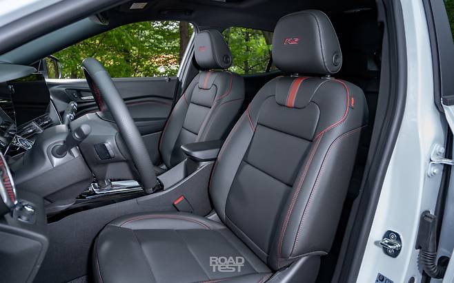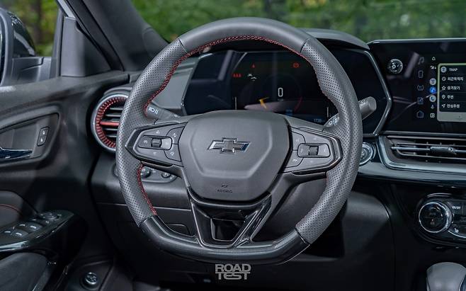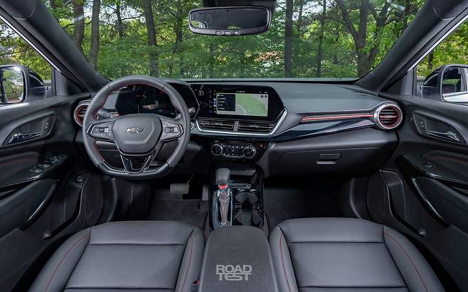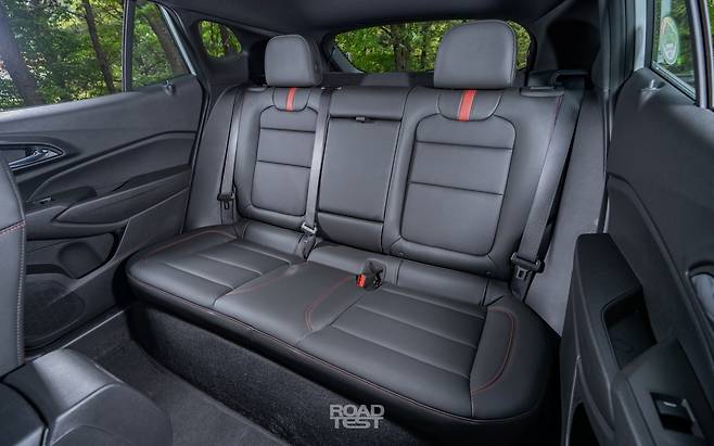 반면, 트랙스는 오롯이 운전자를 위한 공간으로 젊게 꾸몄다. 시승차인 RS 트림은 스포츠카 카마로와 비슷한 고성능 분위기를 앞세운다. 운전석 쪽으로 과감히 비튼 센터페시아와 11인치 디스플레이를 중심으로, 가죽의 이음새까지 빨간 실로 메워 눈이 즐겁다. 송풍구 디자인도 평범하지 않다. 또한, 대시보드와 벨트 라인이 상대적으로 높아, SUV보단 고성능 스포츠 해치백에 탄 듯한 착각을 불러일으킨다. 다만, 피아노 블랙 패널을 광범위하게 사용해, 낯 시간 운전할 때 빛이 반사돼 눈이 피곤했다.