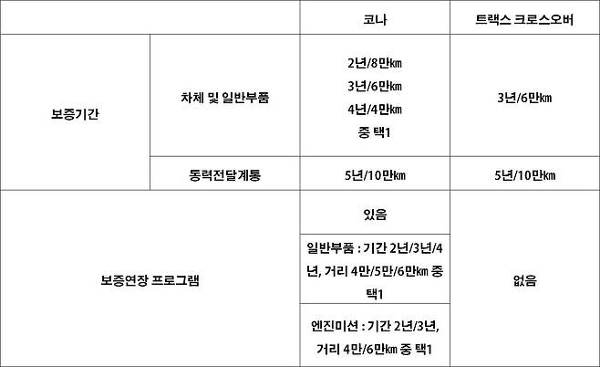 제조사 보증기간도 꼼꼼히 체크하면 좋다. 보증기간은 크게 ‘차체 및 일반부품’과 ‘동력전달계통’ 두 가지로 나눈다. 먼저 차체 및 일반부품 보증기간은 두 제조사가 비슷하다. 3년/6만㎞ 보증이 기본이며, 현대차는 2년/8만㎞, 4년/4만㎞로 선택할 수도 있다. 자신의 연간 주행거리에 따라 고르면 좋다. 동력전달계통 보증은 두 차 모두 5년/10만㎞로 넉넉하다.