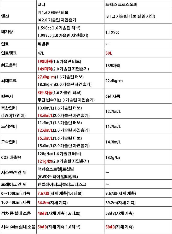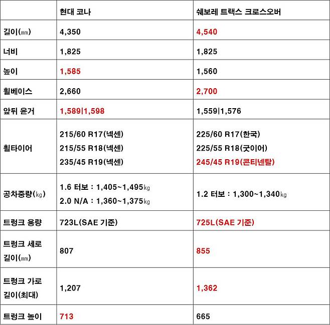 공차중량은 몸집이 큰 트랙스가 되레 더 가볍다. 1,300~1,340㎏이며, 코나는 1.6 터보가 1,405~1,495㎏, 2.0 가솔린이 1,360~1,375㎏이다. 트렁크 용량은 두 차 모두 SAE 기준으로 코나가 723L, 트랙스가 725L로 쉐보레가 소폭 크다.