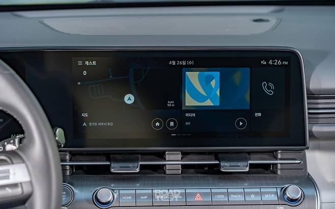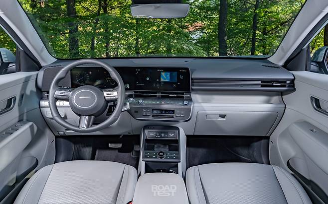 두 차의 실내 분위기는 180° 다르다. 코나는 시원한 공간감을 강조한 아이오닉 5와 닮았다. 12.3인치 디지털 계기판과 12.3인치 중앙 모니터를 연결했다. 화면이 크지만, 사용빈도가 높은 공조장치 등은 아래에 물리 버튼으로 마련해 마음에 든다. 또한, 버튼의 간격과 크기, 폰트 등이 커 직관성이 뛰어나다. 특히 이전보다 수납공간을 다양하게 확보한 점도 좋다. 동반석 대시보드엔 길쭉한 트레이를 심었고, 기어레버를 아이오닉 5처럼 스티어링 컬럼으로 옮기면서 넉넉한 센터콘솔 수납함을 마련했다. 도어 포켓도 트랙스보다 한층 크다.