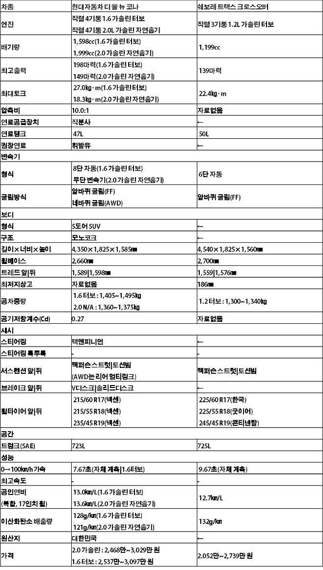 최근 나란히 신 모델로 거듭난 두 대의 B-세그먼트 소형 SUV, 현대자동차 디 올 뉴 코나(이하 코나)와 쉐보레 트랙스 크로스오버(이하 트랙스)를 비교 시승했다. 차체 크기와 실내 공간, 안전 및 편의사양, 주행성능, 가격 및 유지비용 등 6가지 항목에 걸쳐 두 맞수를 저울질했다. 과연 나에게 더 맞는 차는 어떤 모델일까?