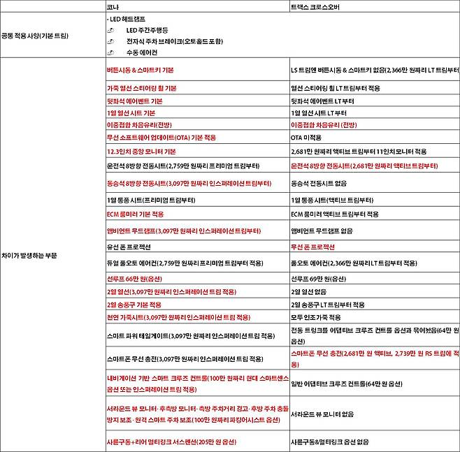 반면, 코나는 표시가격이 전보다 한층 올랐다. 그런데 두 차를 1:1로 비교하면 네티즌의 악플 세례가 억울하다. 가령, 버튼시동 & 스마트키, 가죽 열선 스티어링 휠, 2열 송풍구, ECM 룸미러, 12.3인치 중앙 모니터, 무선 소프트웨어 업데이트(OTA)가 모두 기본 트림부터 들어간다. 이는 캐스터 – 베뉴 – 코나 – 투싼으로 이어지는 라인업에서, 베뉴와 확실한 서열정리를 통해 판매 간섭을 없애겠단 의도가 깔려있다.