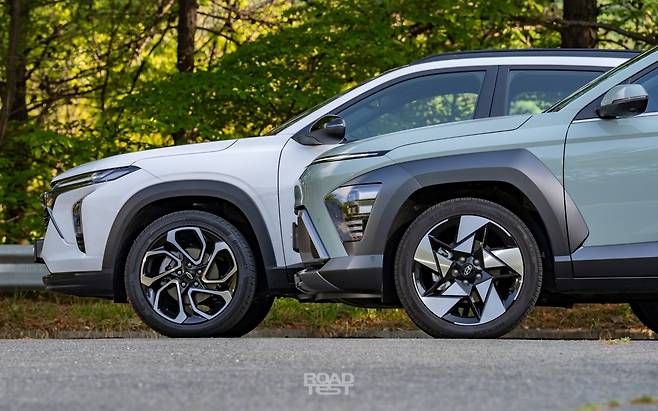 차체 너비는 두 차 모두 1,825㎜. 휠베이스는 트랙스가 40㎜ 더 길다. 반면, 앞뒤 윤거는 코나가 22~30㎜씩 넉넉해, 좀 더 다부진 느낌을 앞세운다. 휠은 두 차 모두 17인치부터 19인치까지 3가지를 신는다. 다만, 타이어는 트랙스가 10㎜씩 더 크다. 아래 ‘주행성능’ 평가에서 자세히 언급하겠지만, 3기통 1.2 터보 엔진에 245/45 R19 휠타이어 조합은 다소 ‘오버스펙’이다. 성능과 승차감, 연비에 균형을 챙긴 17~18인치 조합이 알맞다.