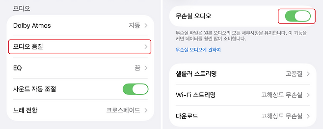애플 뮤직에서 무손실 음원을 듣기 위해서는 간단한 설정이 필요하다. 음악 앱 설정에 들어가 오디오 음질 항목에서 무손실 오디오를 활성화하면 된다. 여기서 셀룰러 모드와 와이파이 모드에서 음질을 설정할 수 있는데 고해상도 무손실로 재생하면 노래 한 곡에 145MB의 데이터가 필요해 주의가 필요하다.