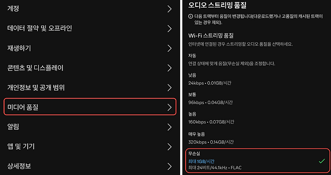 스포티파이는 비교적 최근에 무손실 음원 서비스를 시작했다. 월 요금은 애플 뮤직보다 3,000원 더 비싼 11,990원이다. 음질은 최대 24bit/44.1kHz로 애플 뮤직보다는 낮은 편이다. 대신에 애플 뮤직과 비교해서 노래 추천 AI 알고리즘이 더 뛰어나 내 취향에 맞는 노래를 찾기 편하고, 스포티파이 커넥트 기능을 활용해 다양한 오디오 기기로 무손실 음원을 재생할 수 있다는 매력이 있다.
