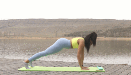 매트 위에 플랭크 기본자세로 시작합니다. 오른쪽 팔꿈치를 구부려 팔을 바닥에 대고, 이어서 왼쪽 팔꿈치도 구부려 양 팔꿈치가 바닥에 닿도록 합니다. 차례로 팔꿈치를 펴면서 다시 손바닥이 바닥에 닿도록 하여 원래의 플랭크 자세로 돌아옵니다.