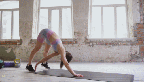 매트 위에 플랭크 기본자세로 엎드립니다. 엉덩이를 들면서 상체를 내리고, 팔을 쭉 펴서 다운도그 자세를 만듭니다. 동시에 오른손을 왼발로 뻗으세요. 원래 자세로 돌아오면, 같은 방법으로 왼손을 오른발로 뻗습니다.