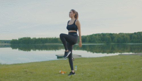 바닥에 서서 발을 어깨너비로 벌리고 준비합니다. 왼쪽 다리를 뒤로 크게 한 걸음 뻗으면서 런지 자세를 취합니다. 원래 자세로 돌아오면서 왼쪽 무릎을 공중으로 높이 들어 올리며 균형을 잡습니다. 이 동작을 반복한 후, 다리를 바꿔서 운동하세요.