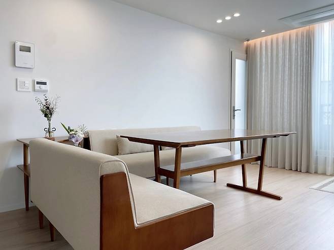확장에 화이트&우드 톤을 맞춰 꾸민 거실의 리모델링 후 모습! 저희는 손님 초대를 좋아하는 편이라 대략 8명 정도의 인원이 다같이 둘러 앉을 수 있는 넓은 테이블이 거실에 있음 좋겠다 생각했어요.