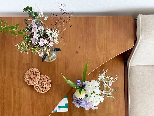 더불어 제가 꽃 만지는 것을 좋아해서 1~2주에 한 번씩 꽃을 사다가 화병에 꽂아두는데요. 그럴 때 다른 공간 찾을 필요 없이 여기 테이블 위에 쫙 펼쳐 놓고 할 수 있어서 너무 좋아요!
