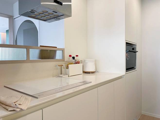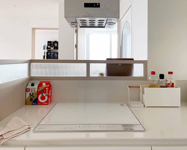벽을 허물었던 현관 쪽에는 모자란 주방의 조리 공간을 늘리기 위해 파티션을 세우고 안쪽으로 인덕션 등 조리대를 마련해뒀어요. 또한, 거실과 작은방으로 부터 빛이 들어올 수 있도록 위쪽은 막지 않도록 오픈해 두었습니다. 덕분에 완벽한 대면형 주방은 아니지만 비슷한 모양새를 낼 수 있게 되었는데요.