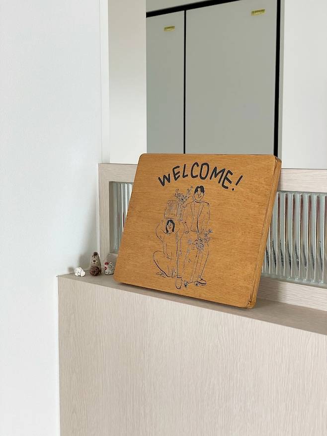 이 파티션은 현관에서 바로 들어와 보이는 공간이라서 최근 선물 받은 웰컴 현판을 올려뒀어요! 아직 자리를 잡지 못해 여기에 두었는데 꽤나 잘 어울려서 우선은 그대로 두고 있답니다.